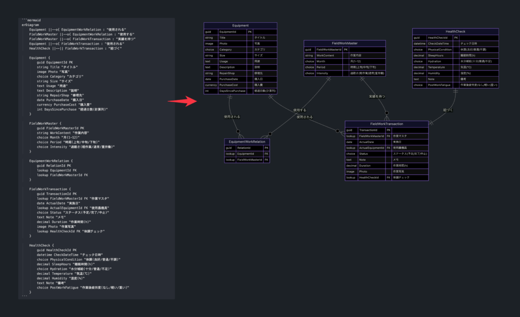Mermaid記法ではエンティティ図が書けます。テーブル名・PK・データ型・カラム名を定義して、リレーションまで表現して整理しています。これはアプリを作成した後に、誰かにデータの繋がりはこうなっていると説明する時にも使えます。設計がそのまま説明資料にもなるのが良い。