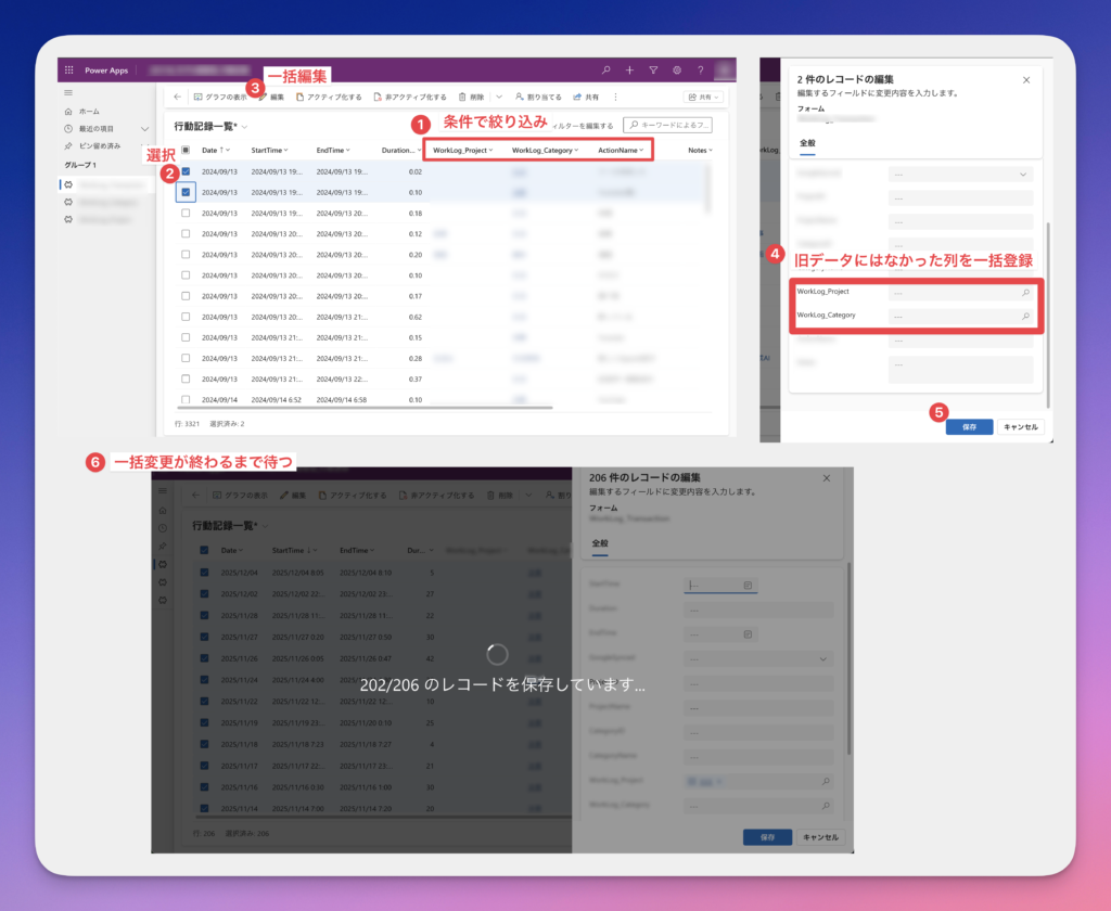 Googleフォーム時代には入力していなかったプロジェクト名やカテゴリー名を、フィルター機能で絞り込んでから一括選択し、一気に入力しました。例えば「Power Apps」を含むデータをフィルタリングして、そのすべてに「Power Apps」を割り当てる、といった作業が数クリックで完了します。