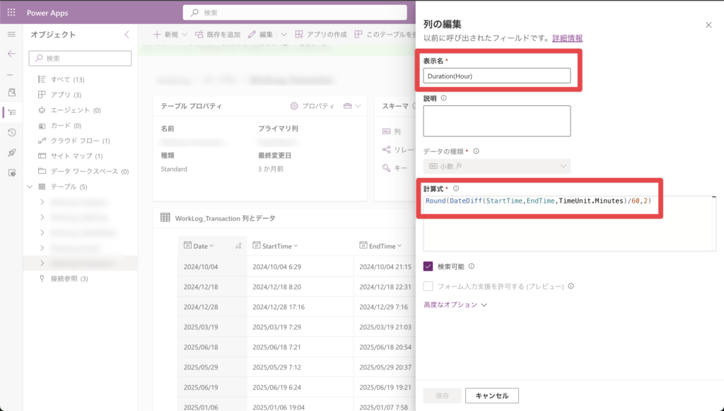 開始日時(StartDate)と終了日時(EndDate)から、行動の継続時間(Duration)を計算する列を作成しました。キャンバスアプリでデータを作るタイミングでやろうとすると面倒臭いので、今後はアプリでやると面倒なやつはDataverse側でやろうと思います。