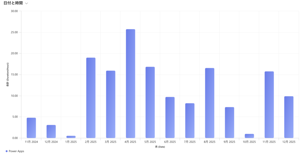 ついでに、モデル駆動型でグラフを作ってプライベートでPower Appsに費やした時間を可視化してみました。合計、156時間でした。(あと、今日だけで4.4時間でした笑)