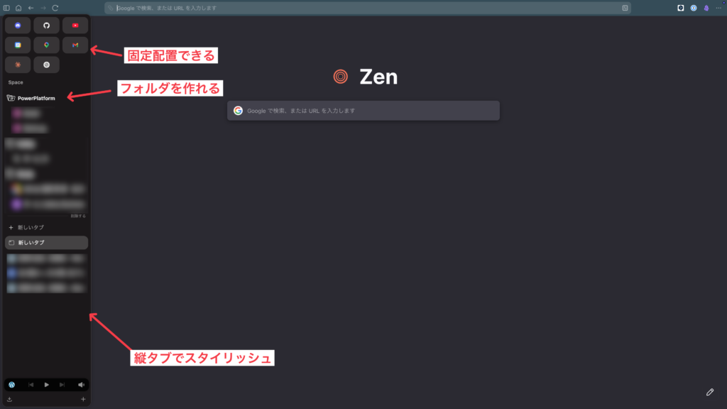 「Zen」というブラウザを使ってみています。Google Chromeだと開いているブラウザを縦タブにできないので、変えてみたいと思いました。とにかくスタイリッシュな感じでいいです。