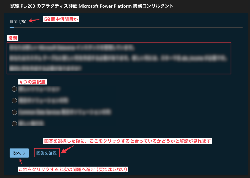 MicrosoftのPL-200のページ下部に、これがあります。ここから50問試験問題を解くことができます。最後まで一気に回答しないと最初からやり直しになるので、注意が必要です。