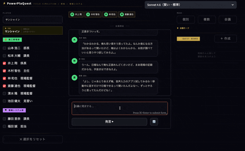 PowerPlaQuestは、架空の建設会社「市民開発建設株式会社」に情報システム部員として参加し、社員AIエージェントたちと会話しながら Power Platform(Power Apps・Power Automate等)で業務改善クエストをこなすゲーム です。