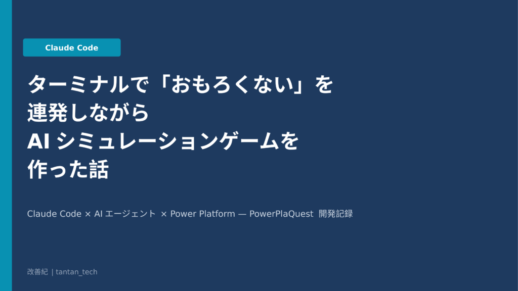 Contents この記事を読んでわかることはじめに作ったもの:PowerPlaQuestとは開発の流れClaude Codeとの開発体験で気づいたこと残課題と次回おわりに技術スタックこの記事を読んでわかること はじめに … 続きを読む 【Claude Code】ターミナルで「おもろくない」を連発しながらAIシミュレーションゲームを作った話