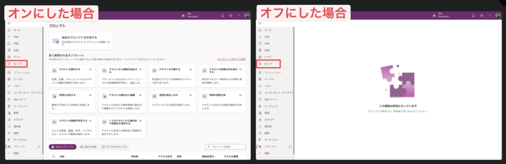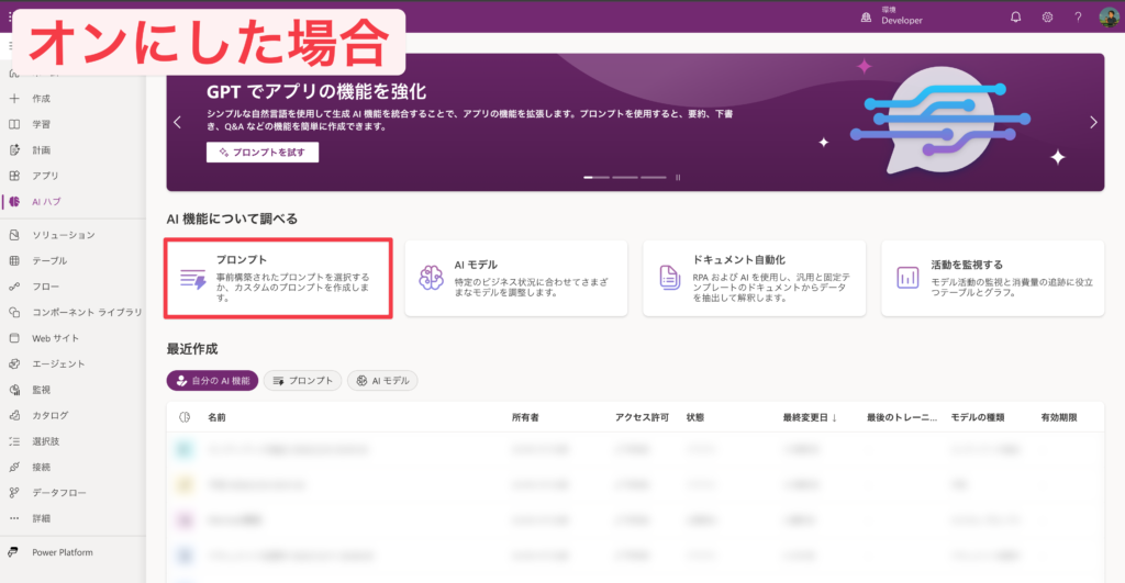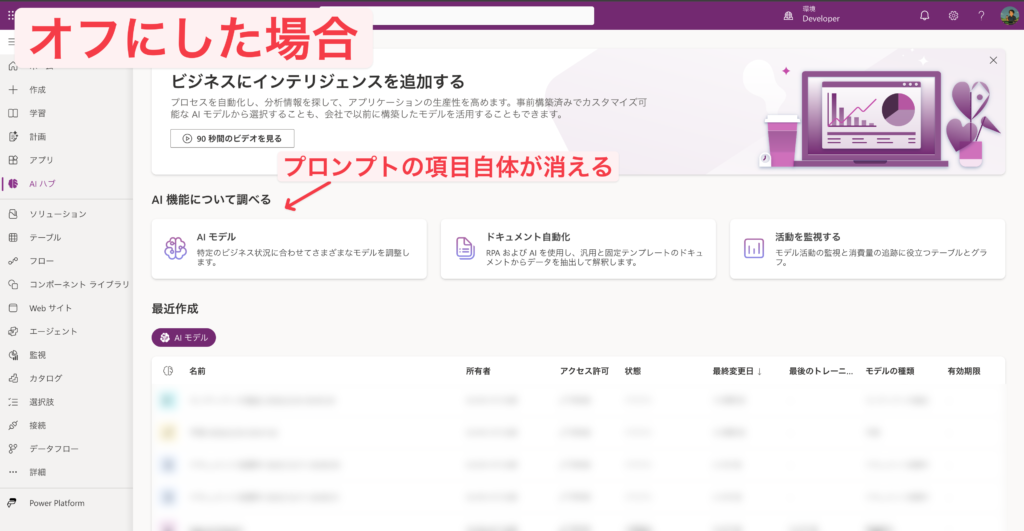 Power Apps→AI ハブから、カスタムプロンプトの作成ができなくなりました。項目自体が消えます。