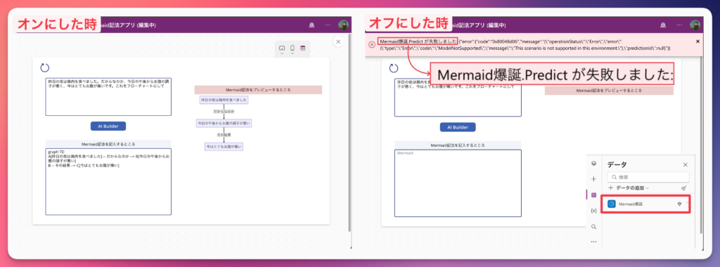 作成済みのPower Appsで挙動を見てみます。オフにすると実行が失敗になります。